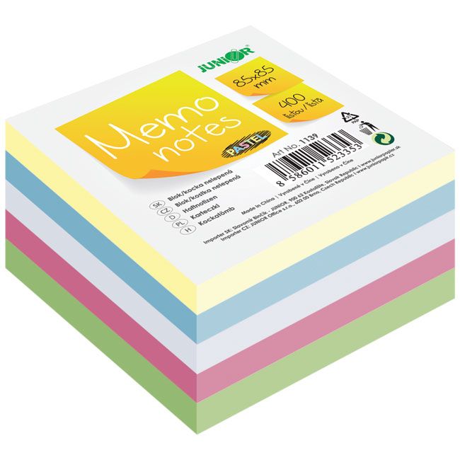 Цветно хартиено кубче Junior - 85х85х45мм, 500л. залепено, пастелни цветове